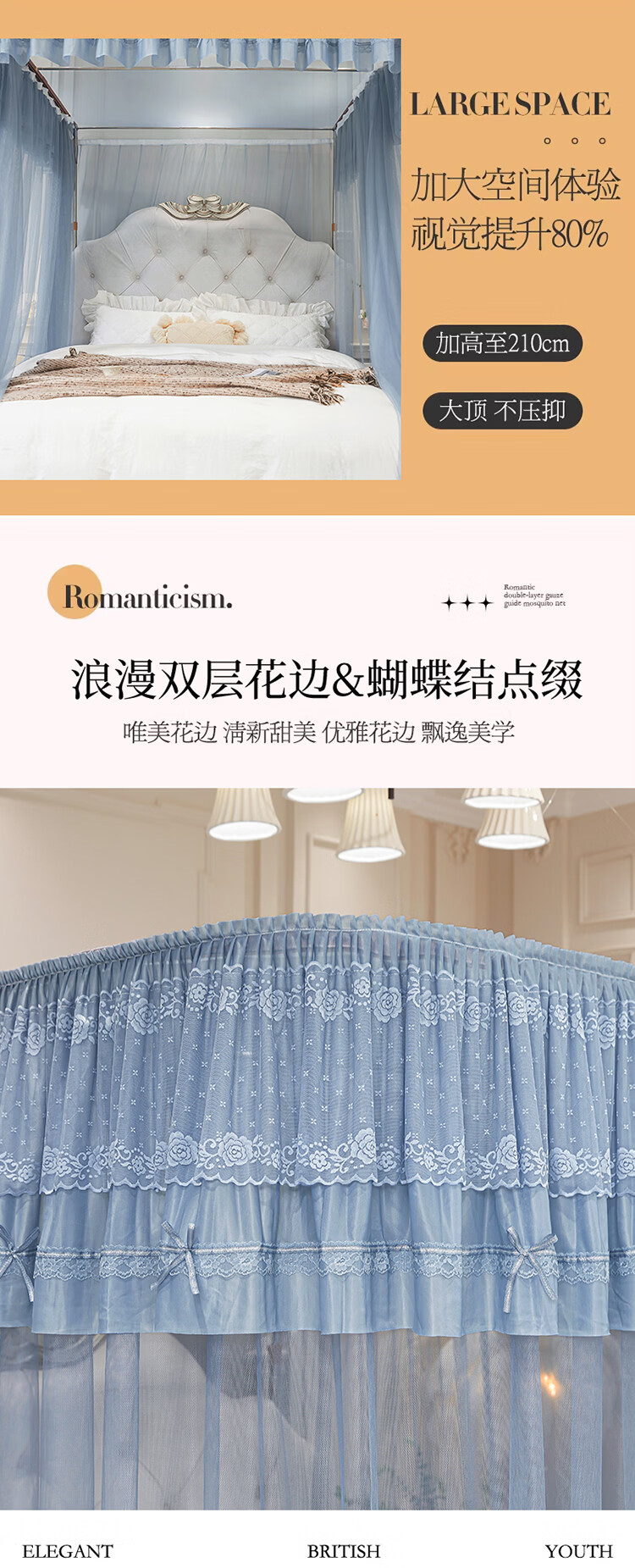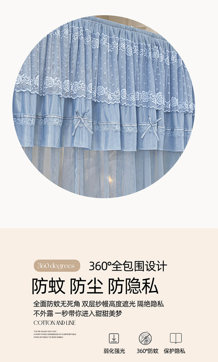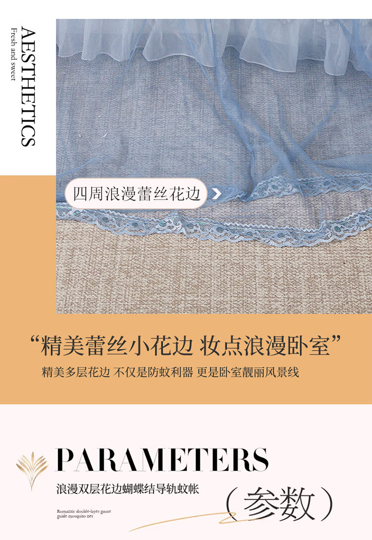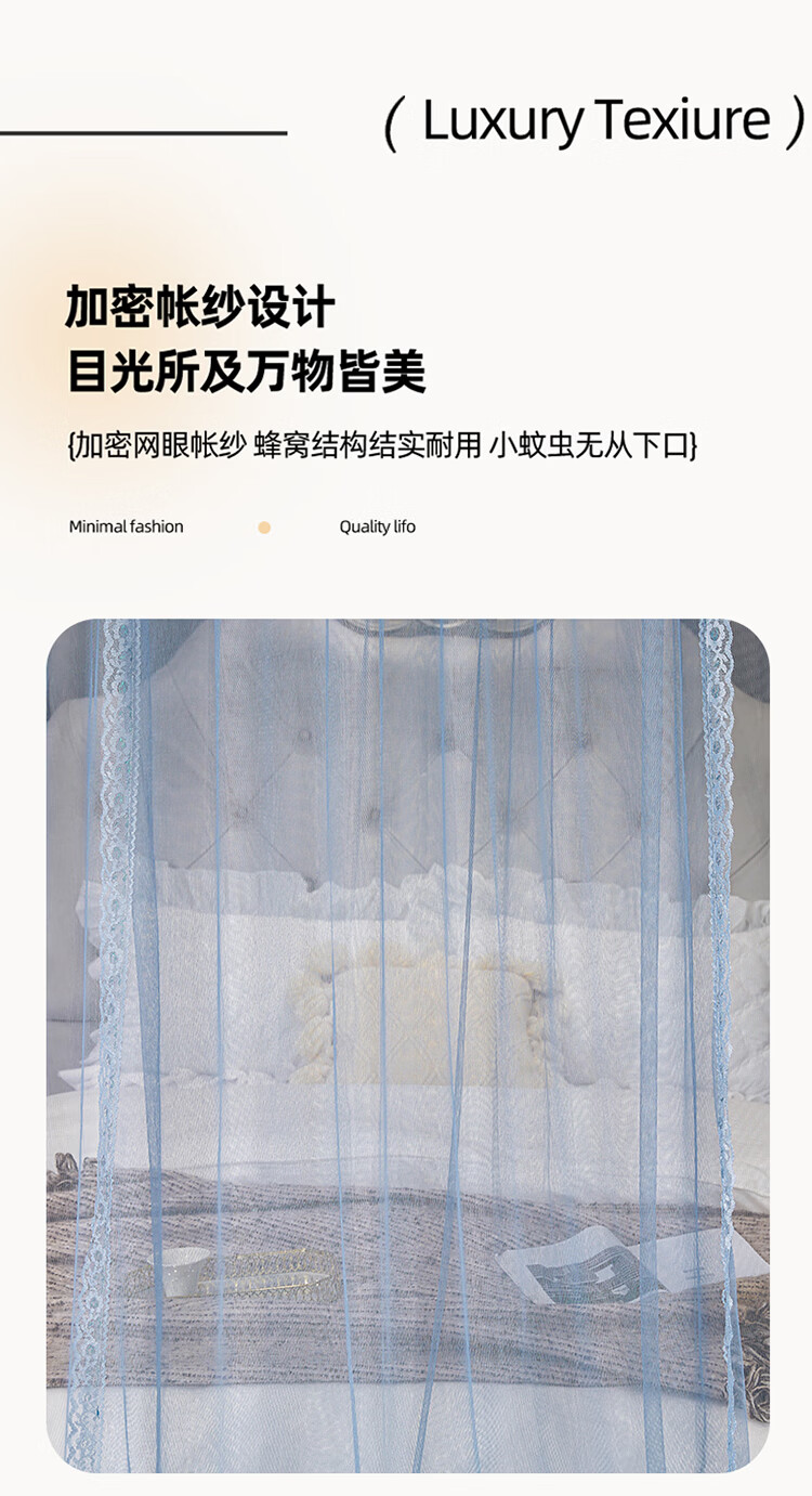 无印良品u型导轨蚊帐1.8x2米家用免安装2026新款蕾丝落地全包围防蚊一体式 花香其乐-蓝灰【随意调高度 滑轮不卡顿】 120cm*200cm*210cm 【加粗支架 铝合金导轨】