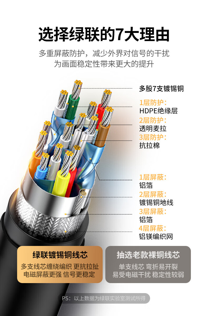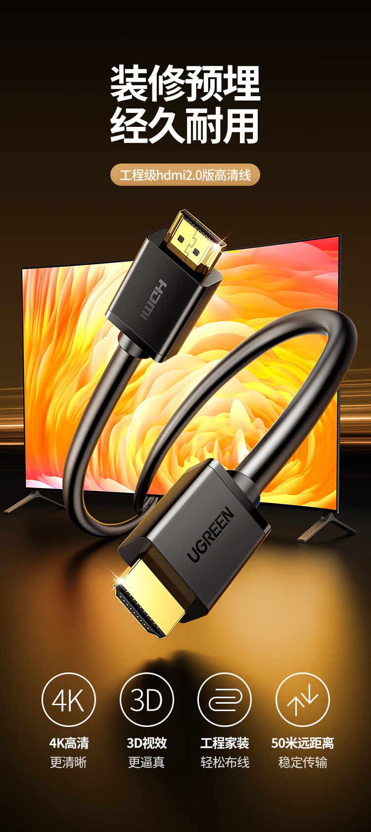 绿联HDMI线2.0版 4K数字高清线 3D视频线工程级笔记本电视投影仪大屏装修穿管视频线显示器连接线 黑色工程版 【京配】3米