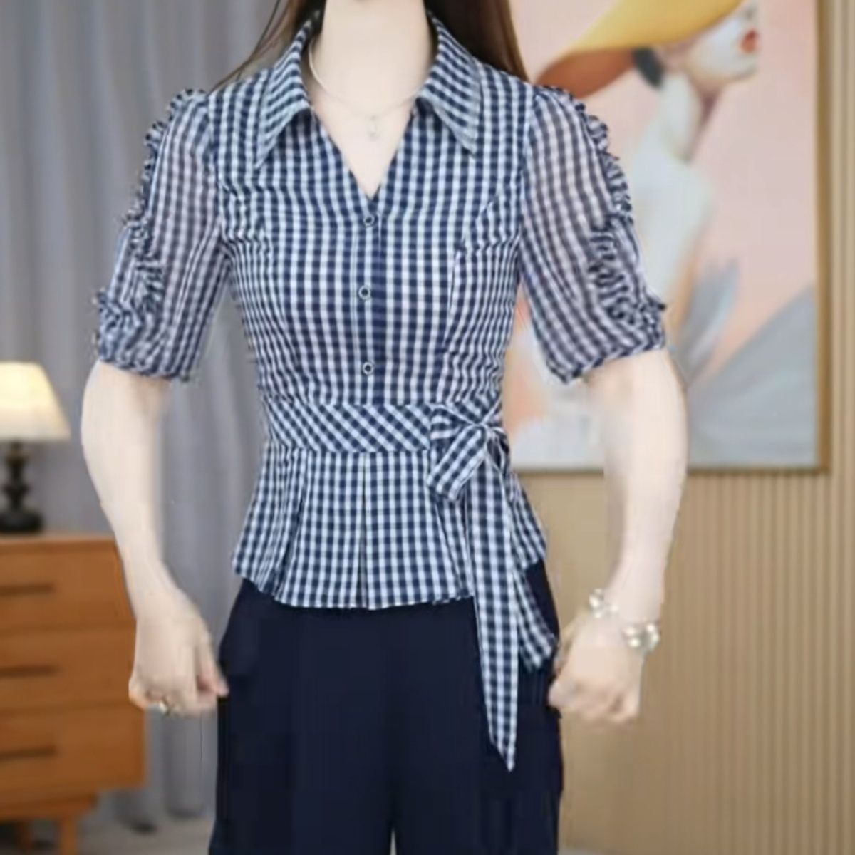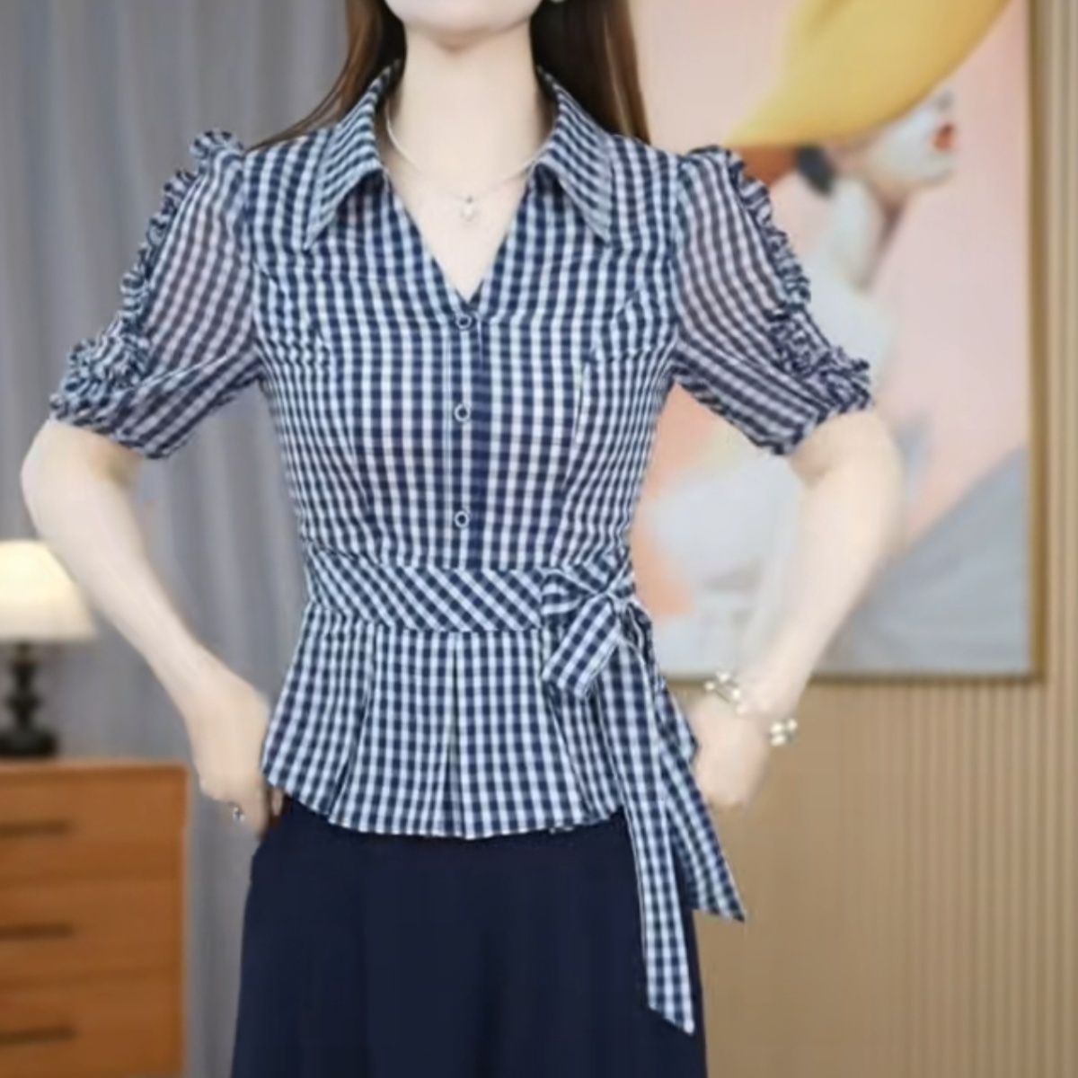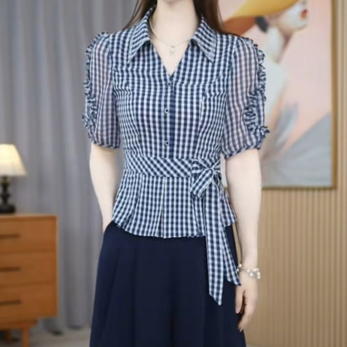 2026夏季新款格子休闲衬衣蝴蝶结短袖时尚宽松显瘦洋气百搭减龄【5月25日发完】