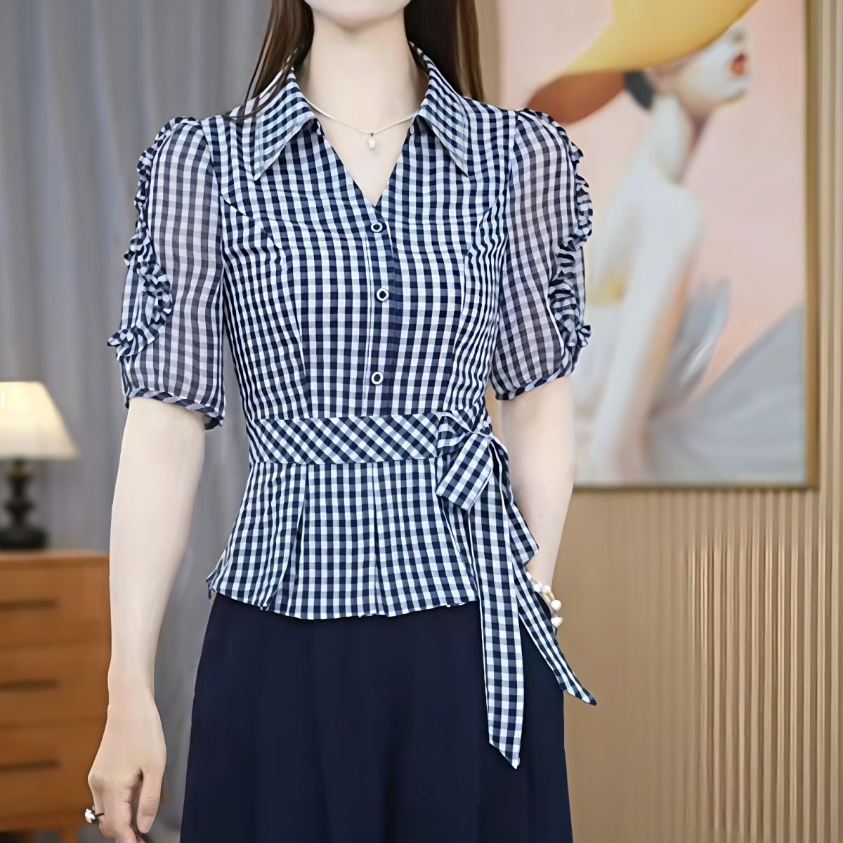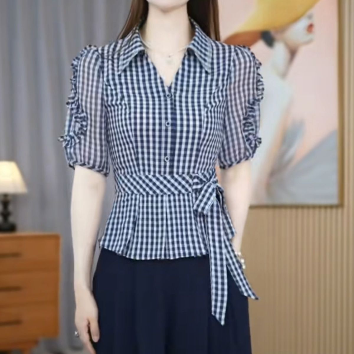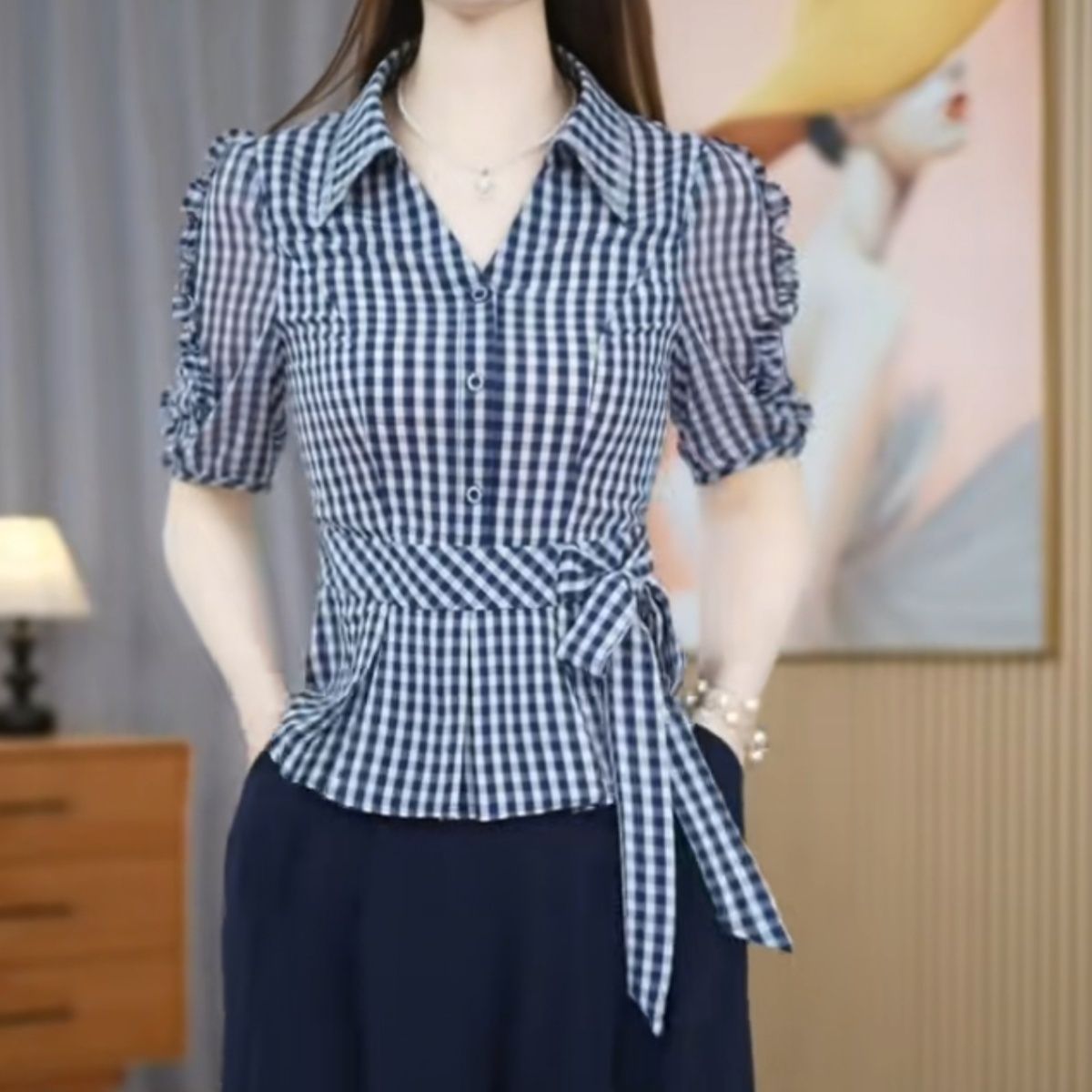 2026夏季新款格子休闲衬衣蝴蝶结短袖时尚宽松显瘦洋气百搭减龄【5月25日发完】