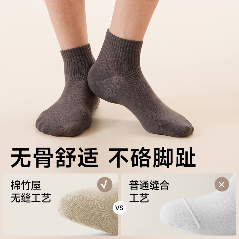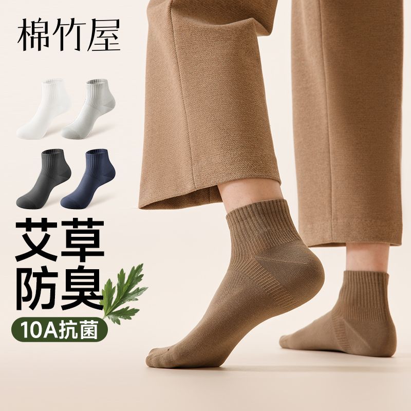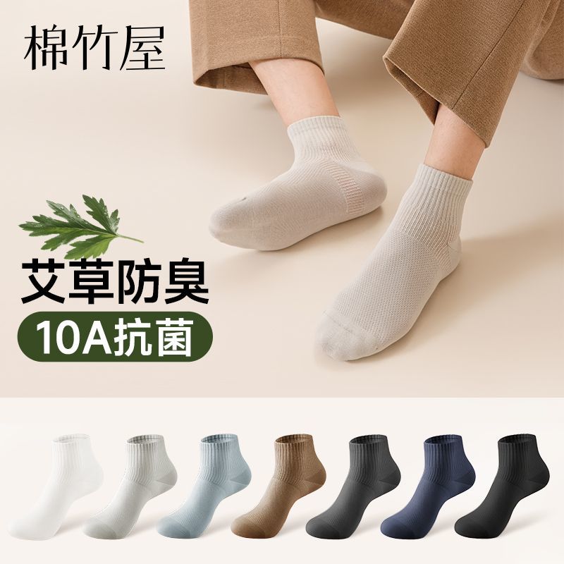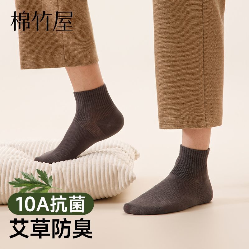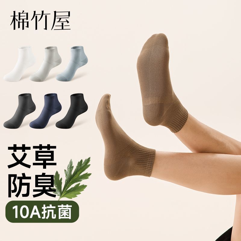 棉竹屋袜子男春夏短筒袜100%棉艾草防臭10A抗菌运动中短筒袜