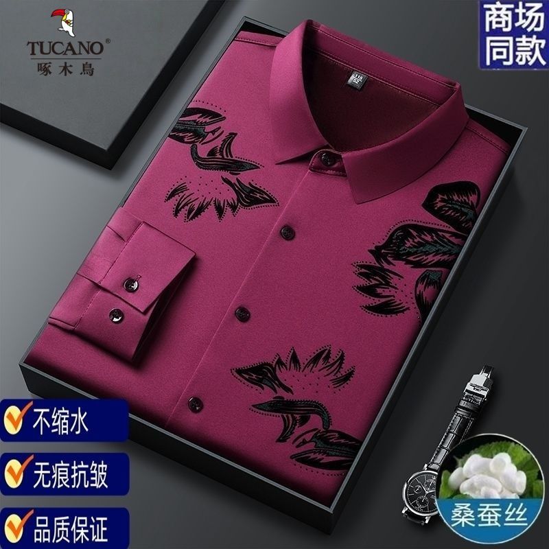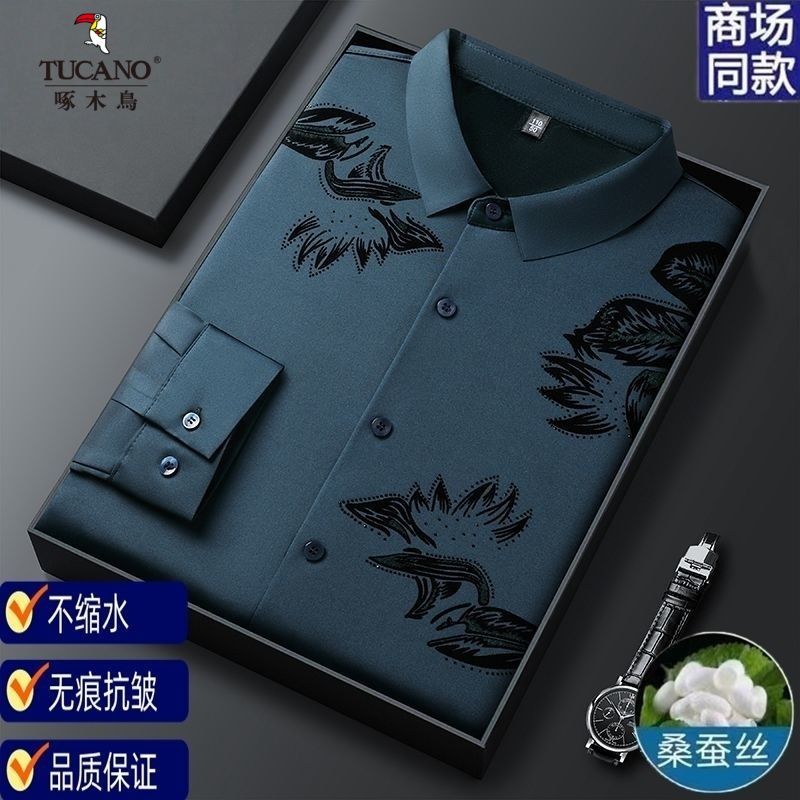 啄木鸟春秋新款桑蚕丝弹力抗皱男士长袖衬衫无痕免烫日常百搭衬衣